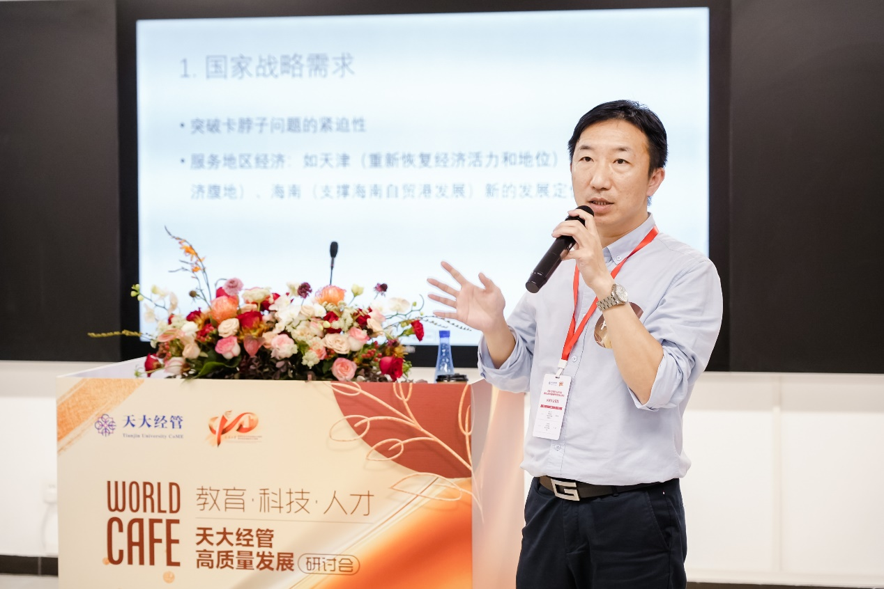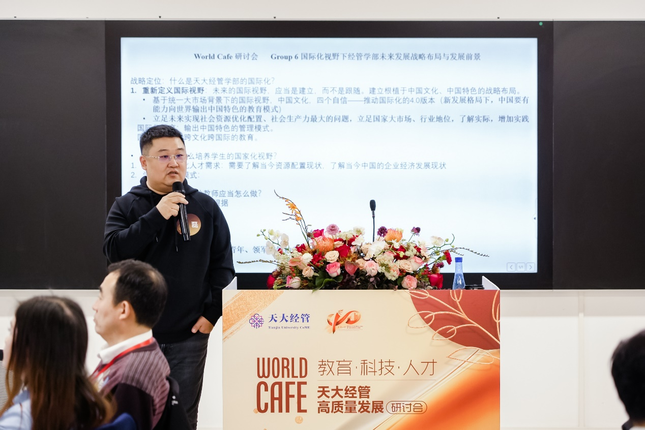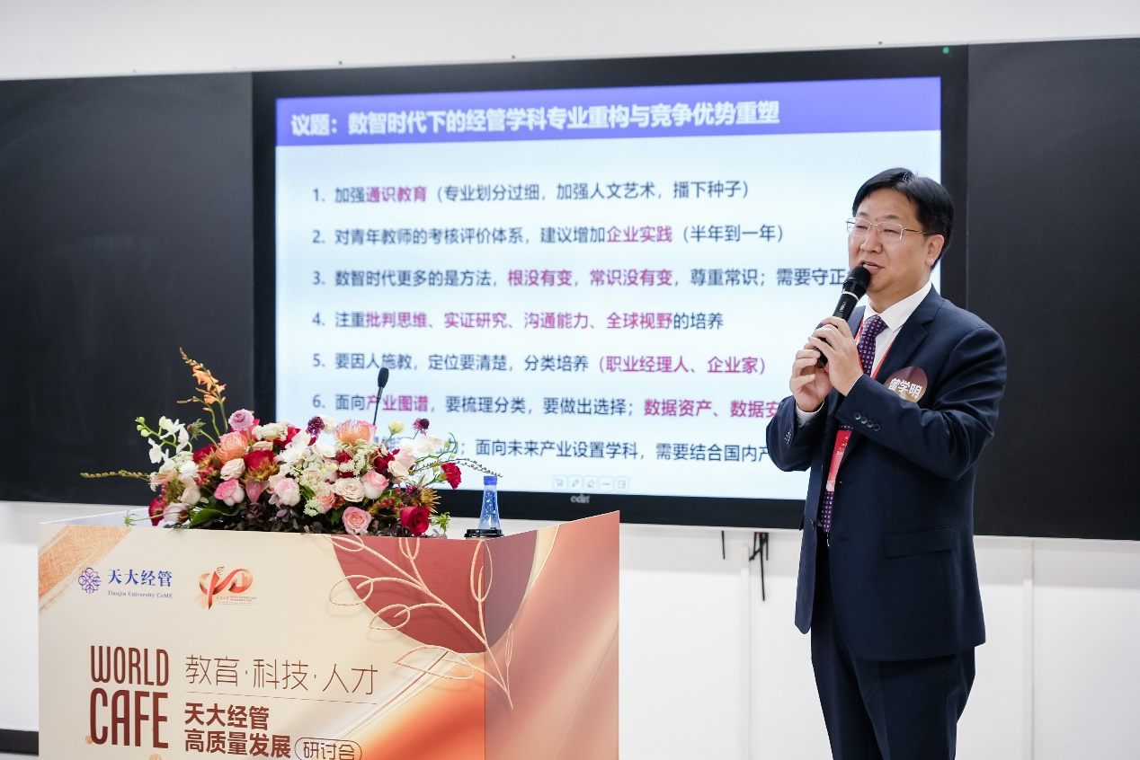 下午,World Cafe教育·科技·人才天大经管高质量发展研讨会在25教学楼召开。与会嘉宾分组就“教育科技人才一体化背景下的产学研合作与资源拓展”“数智时代下的经管学科专业重构与竞争优势重塑”“国际化视野下经管学部未来发展战略布局与发展前景”等议题展开热烈讨论。研讨会由管理与经济学部主任杜慧滨主持。