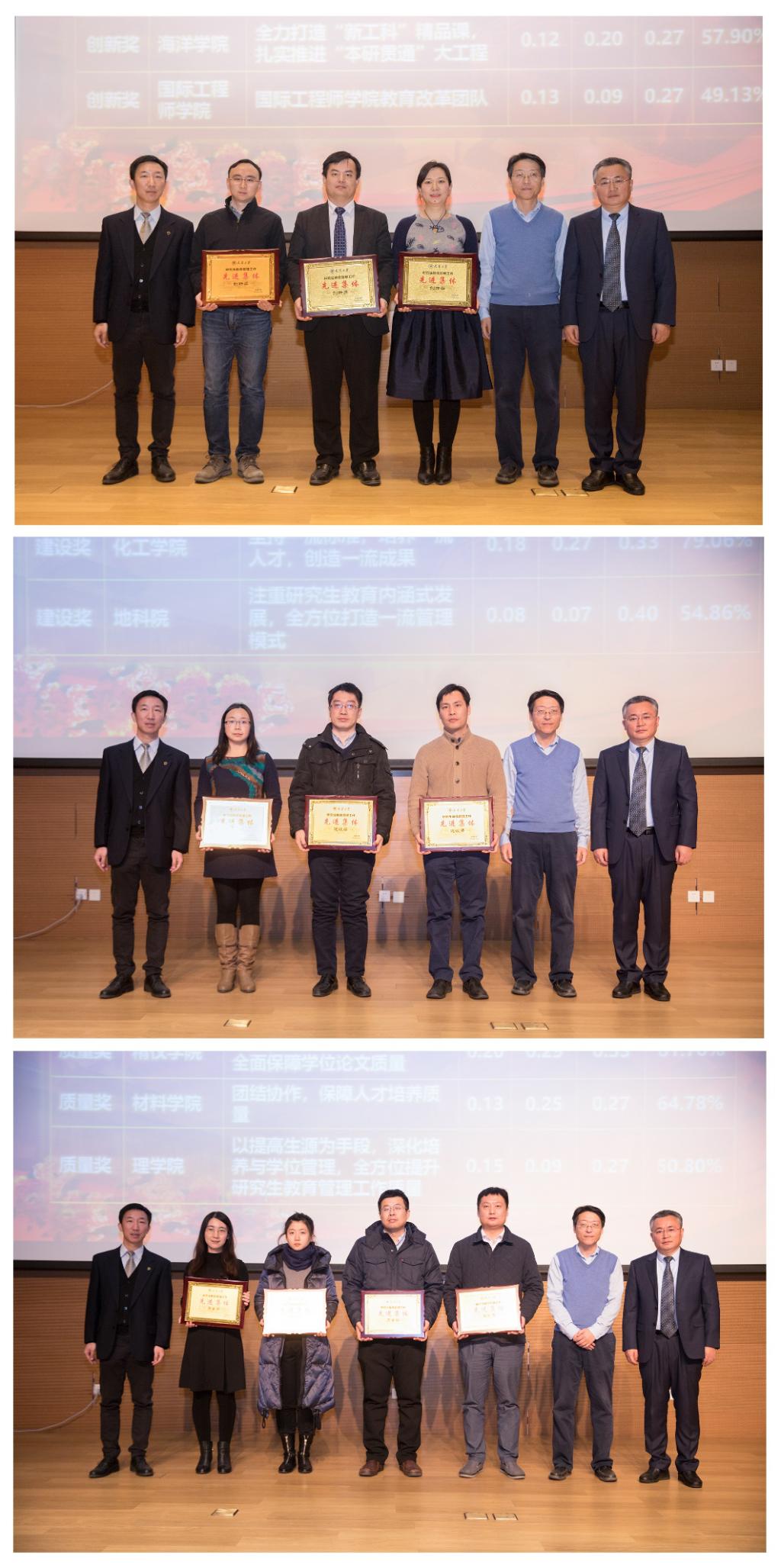 此外,会议表彰了在2018年中为我校研究生教育管理工作积极探索、勇于创新、做出杰出贡献的优秀案例及先进集体。本次奖项设立研究生教育管理工作先进集体创新奖、建设奖及质量奖,经学院申报,共18个学院参评。通过学院互评、工作人员投票和特约评委投票等几个环节,最终十个院级单位凭借出色的工作案例获得奖项。其中环境学院、海洋学院、国际工程师学院获得创新奖,医工院、化工学院、地科院获得建设奖,机械学院、精仪学院、材料学院、理学院获得质量奖。