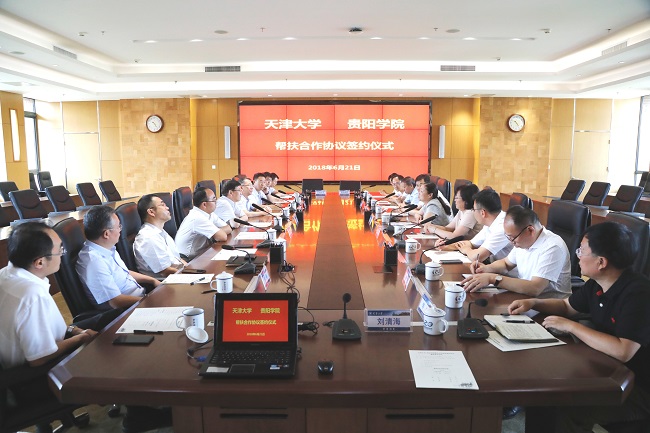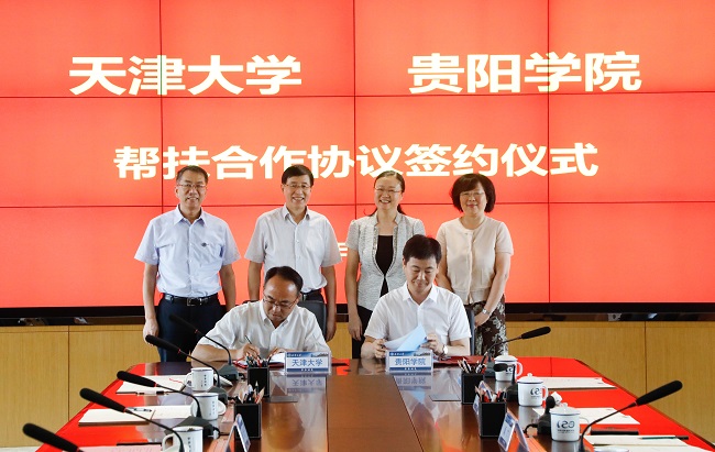本站讯 (记者赵晖 摄影唐蒙)6月21日上午,天津大学与贵阳学院在北洋园校区签署《天津大学贵阳学院帮扶合作协议》,双方将紧密围绕学科建设、师资队伍培养、科学研究等方面加强联系,进一步明晰帮扶体系建设目标和任务。天津大学党委书记李家俊,党委副书记、纪委书记孙广平,副校长胡文平,贵阳学院校长毛有碧,副书记杨青,副校长刘刚,贵阳市人民政府副秘书长宋叙言,两校有关负责同志一同参加签约仪式。