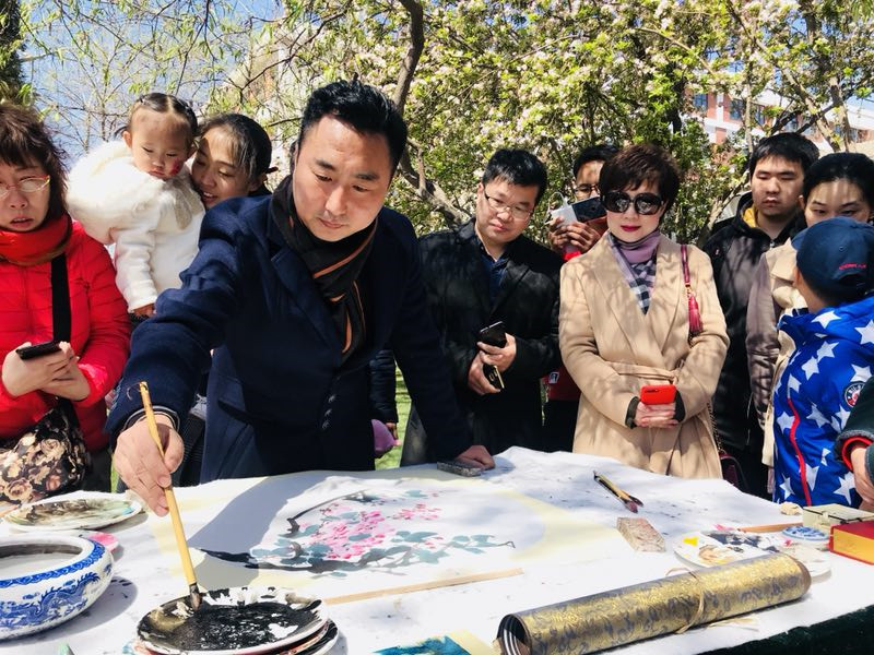以花为媒,王学仲艺术研究所和天津高校书画联盟的师生用青春的画笔,为游客绘出绚烂的海棠美景,留下动人回忆。