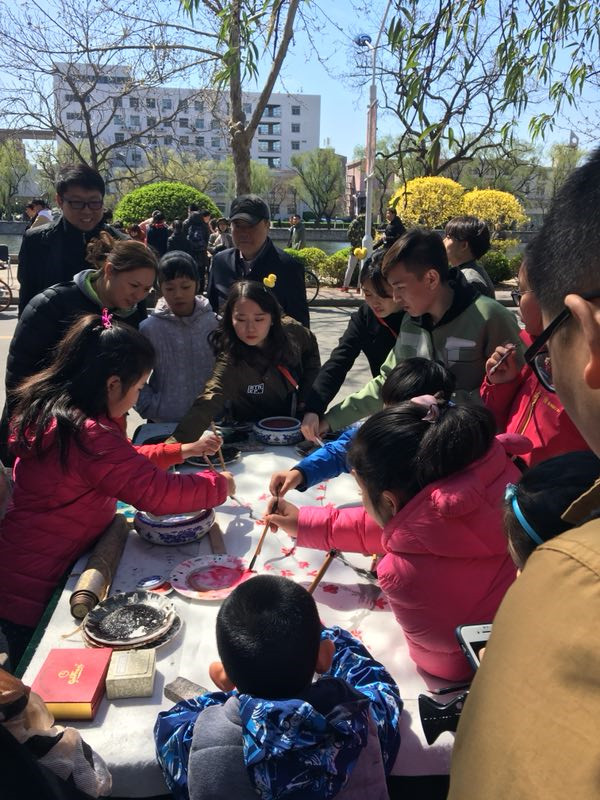 研究所外,刘珺老师与天津高校书画联盟的同学在户外现场创作书画作品,吸引了很多游人围观。刘珺老师运笔沾墨,不一会儿,就勾勒出一枝枝春意盎然的海棠花,与树上开的正旺的海棠花交相辉映。道路另一侧,题字的同学与观光者做游戏,获胜的游客可以定制自己想要书写的内容,很多家长会请“书法家”题写自己孩子的名字作为纪念。有喜好书法绘画的游客也可以现场一展身手,并获得专业的指导和讲解。