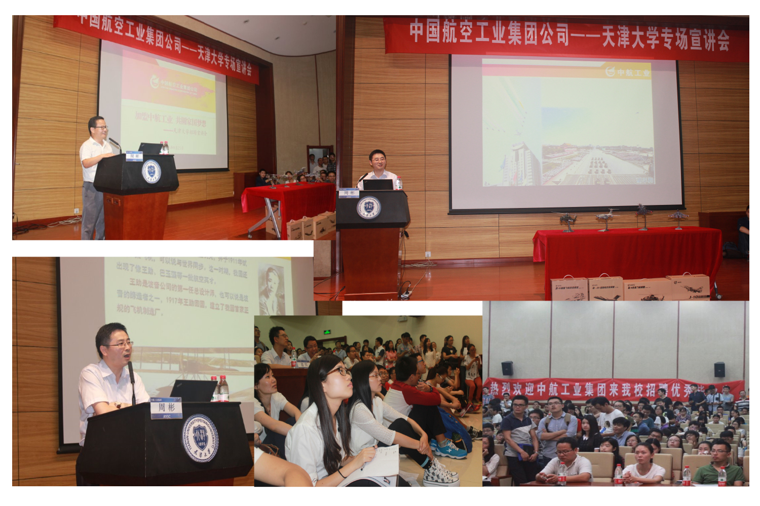 天津大学就业指导中心主任肖述虎主持宣讲会。他首先对此次中航工业集团来天大招聘毕业生表示热烈的欢迎,向中航工业集团近年来对天大人才工作的大力支持表示衷心感谢。随后,周彬校友为天大的学弟学妹们作了内容精彩的报告。周彬校友自豪地向天大学子说,93阅兵中共有10个分队、17个型号、183架飞机飞过天安门,这些飞机全部来自于中航工业集团。为了活跃现场气氛,周彬通过现场提问与天大学子进行了互动,并为幸运观众颁发了歼-10、运-20等飞机模型。在接下来的报告中,周彬校友对中航工业的发展历史、当今综合实力以及企业未来发展等作了详细介绍,还对中航工业集团的招聘需求、晋升通道与薪酬制度等进行了具体阐述。