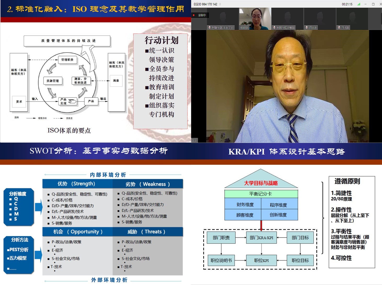 管理与经济学部沈江教授作了题为《管理能力提升与绩效管理——ISO理念及其作用》的报告,报告从四个方面进行了阐述。在战略解码方面,沈江教授从各个管理层级战略关注点、大学发展目标的层次体系、战略性思维及其本质特征、组织发展共性与成长引擎、提升组织绩效的路径等方面分析了绩效管理与组织目标的关系。在标准化融入方面,沈江教授结合美国马可姆·波里奇国家质量奖描述性说明,对ISO理念及其教学管理作用进行了详细的解说。在工具应用方面,沈江详细介绍了SWOT、KRA/KPI、平衡计分卡的分析步骤、实现路径及设计流程。在战略落地方面,沈江教授通过对战略评估、判断核心竞争力与领跑者、波士顿矩阵的介绍,深入浅出的阐释了流程的执行与监管。