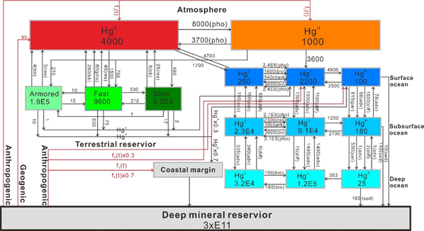全球汞循环模型综合研究汞的排放、迁移、转化与沉降,能够从理论上快速反演环境体中汞的历史变化趋势,并预测未来汞排放所产生的环境影响。但是,过去的汞循环模型参数都是建立在汞形态及其含量的基础上,不确定度较大,存在很大的时间和空间上的变异。稳定汞同位素是近十几年发展起来的用于研究汞循环的有效技术手段,不但能够有效的示踪源区,而且还能够准确的揭示造成汞同位素分馏的地球化学过程。如何把汞同位素模块加入到全球汞循环模型中,进而建立基于汞同位素的全球汞循环模型,存在极大的技术和理论的挑战。