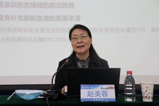 授课中,赵美蓉结合习近平总书记重要讲话、“高校党建二十条”等内容,详细讲解了新时代中央对高校基层党建的新要求。她指出,党的十八大以来,中央高度重视高校党的建设,习近平总书记多次讲话、多次批示,重视程度之高前所未有,高校党建工作面临重大机遇,也面临重大挑战。随后,她分析了我校基层党组织现状,指出基层党组织在取得显著成效的同时,也存在一些问题,需要所有党务工作者高度重视、积极破题。