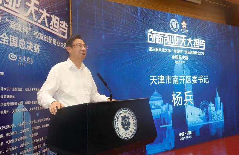 杨兵在开幕式上表示,高校是科技第一生产力和人才第一资源的重要结合点。天津大学校友创新创业大赛挖掘了一大批优秀人才和项目,为广大校友师生提供了展示、交流和成长的舞台,更为推动科技成果转移转化、服务产业升级作出了贡献,展现了新时代天津大学兴学强国的职责使命,和天大学子矢志创新的时代担当。华芯智能、医酷科技等优质项目,先后落户南开,发展态势非常强劲。作为地方党委政府,我们要一如既往地为天津大学发展尽好属地责任,为广大师生和各类人才提供周到细致贴心的服务,搭建施展才华、成就事业的广阔舞台。