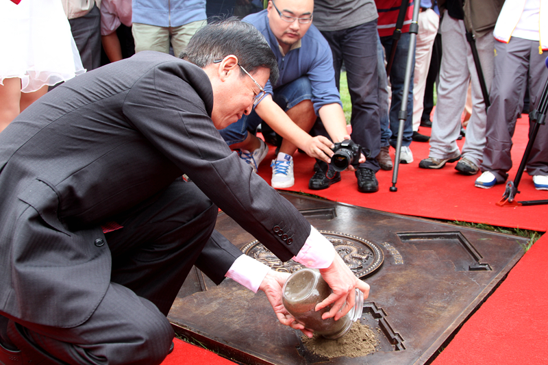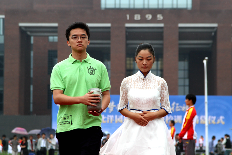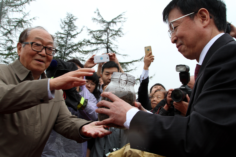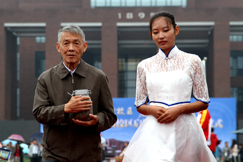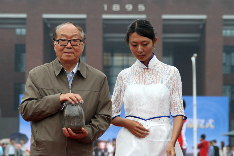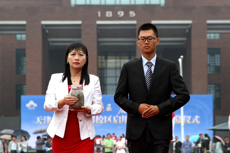 当天,最令人动容的环节就是由天津大学长幼不同的四位校友分别将来自四个校区的校土传递到李家俊校长手中,并由他郑重地封入“封土台”。