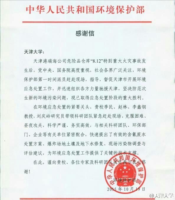 本站讯(通讯员 王杨)天津港“8·12”特别重大火灾爆炸事故的发生,给区域环境造成了严重威胁。为尽快消除环境污染问题,天津大学环境学院积极组织师生参与天津市环保局应急专家组工作,成立水污染、土壤和地下水污染专家咨询组,参加灾后污染应急控制行动,为污染控制预案提供技术咨询。鉴于环境学院科研团队在紧急救援现场的出色表现,11月14日国家环保部发来感谢信向环境学院各位专家及科研团队成员表示衷心感谢。