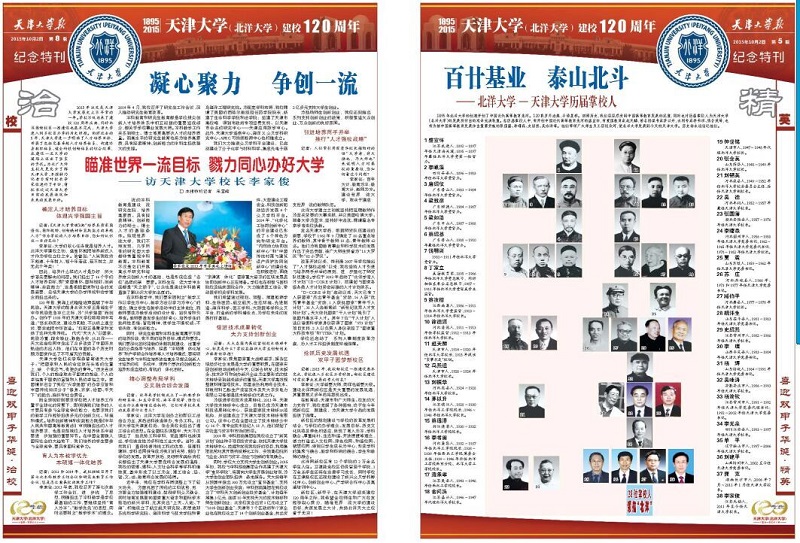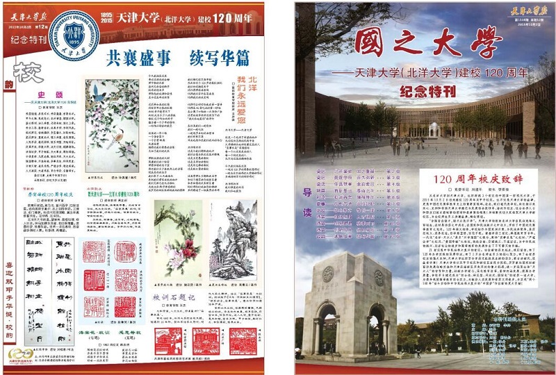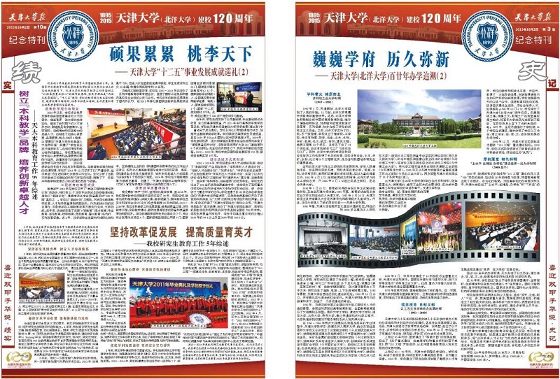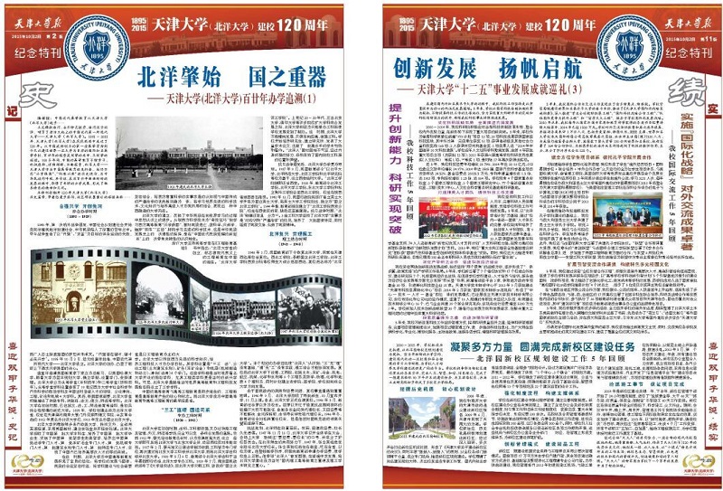 为迎接天津大学120周年校庆,由校报编辑部推出的《天津大学报》120周年校庆纪念特刊经撰写、编辑、拼版、审校、印刷等环节,历时5个月的筹备现正式出版发行。此特刊为对开彩色铜版纸大报,共12个版,图文并茂地展示了120年天大恢弘画卷和卓越成就。此特刊回顾了天津大学120年的历史篇章,纪念百廿辉煌。特刊共由13个版块组成,分别从校史、历史故事、历史名人、校训、历史大事、发展成就等方面介绍了学校的历史文化和继承发展。