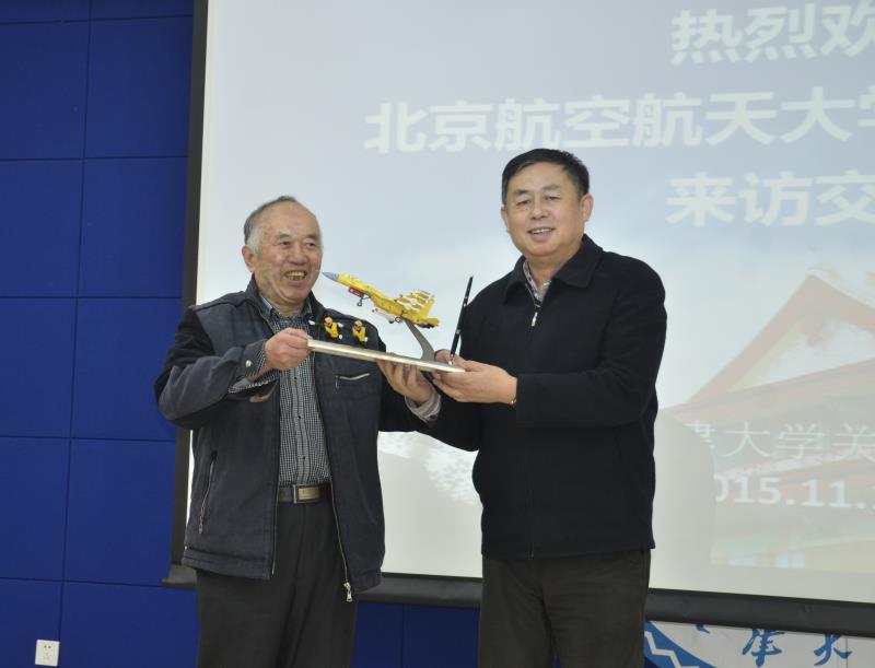 北京航空航天大学关工委副主任曾妙南代表学校对天津大学关工委的工作介绍表示感谢,并向我校赠送了小模型飞机。