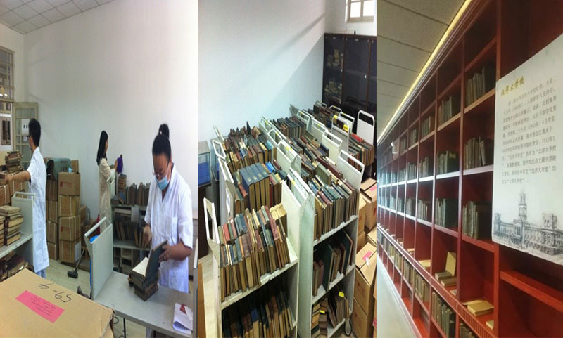 正值7月酷暑,书库中闷热难耐。图书馆的管理系统中完全没有这些一百年前老号书的数据。打开尘封已久的书库,只能靠人工一本本挑选。大家克服暑热,汗流浃背,拍去尘土,欣喜地发现早期西文图书的风采不减当年,一切苦累皆抛之脑后。挑书、除尘、分类、建目录、打包、布展,一项项工作紧锣密鼓地按计划进行着。大家的心愿,就是一定要在开馆和校庆时让师生及校友忆起当年北洋园的风貌。
