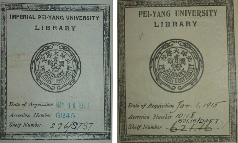此次特展中还挖掘出一批具有文史价值的我馆的馆藏章。如北洋大学堂和北洋大学校时期的藏书票,如今这些珍贵的藏书票已有上百年历史,是中国历史上应用较早的藏书票,同时还有一部分馆藏章充分揭示了院系调整时期的历史。这些图书均盖有原校图书馆印章和天津大学图书馆印章,它们形式各样,精细美观,具有很高的文物收藏和鉴赏价值,是我馆又一独特的宝贵财富。
