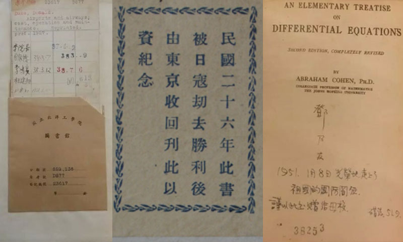 我们在此次布展中发现的最早入藏图书的时间是1903年。据史料记载,截至1934年,我校馆藏西文图书21256册。抗战期间北洋大学图书资料损失惨重,抗战后从天津市立第一图书馆收回散失图书200余箱;从德商新华公司、美商慎昌洋行取回抗战前寄存的图书60箱,再有李书田院长从西安辗转带回的一些西迁图书。在布展过程中,我们惊喜地发现了李书田、魏承孝等人的借书记录卡。整理中我们还发现一些带有抗战纪念意义的图书,看似普通的卡片清晰记录了我们民族和我们学校曾遭受的大劫难和大胜利,控诉了70年前日本帝国主义的侵华罪行。抗战复校后,为补充馆藏,大量师生校友及社会各界人士向图书馆捐赠图书,其中就有著名校友叶叔衡、李安格等人的毕业赠书。有一本书的扉页上写着:“邓乃友,1951.1月8日,光荣地走上了祖国的国防岗位,谨以此书赠给母校”,字里行间洋溢着自豪、喜悦和对母校的眷恋。