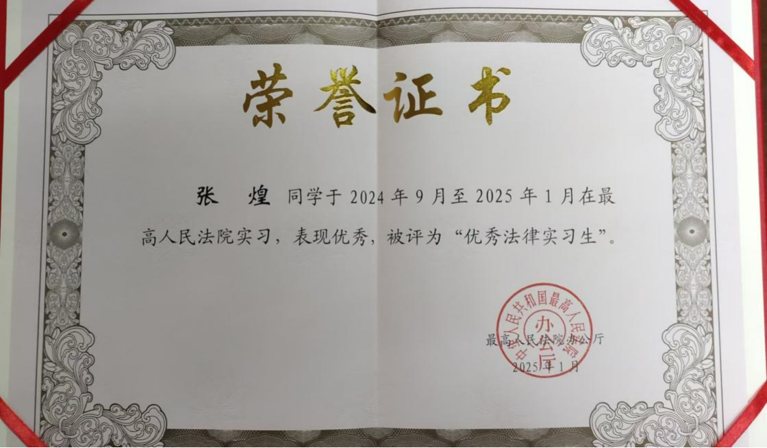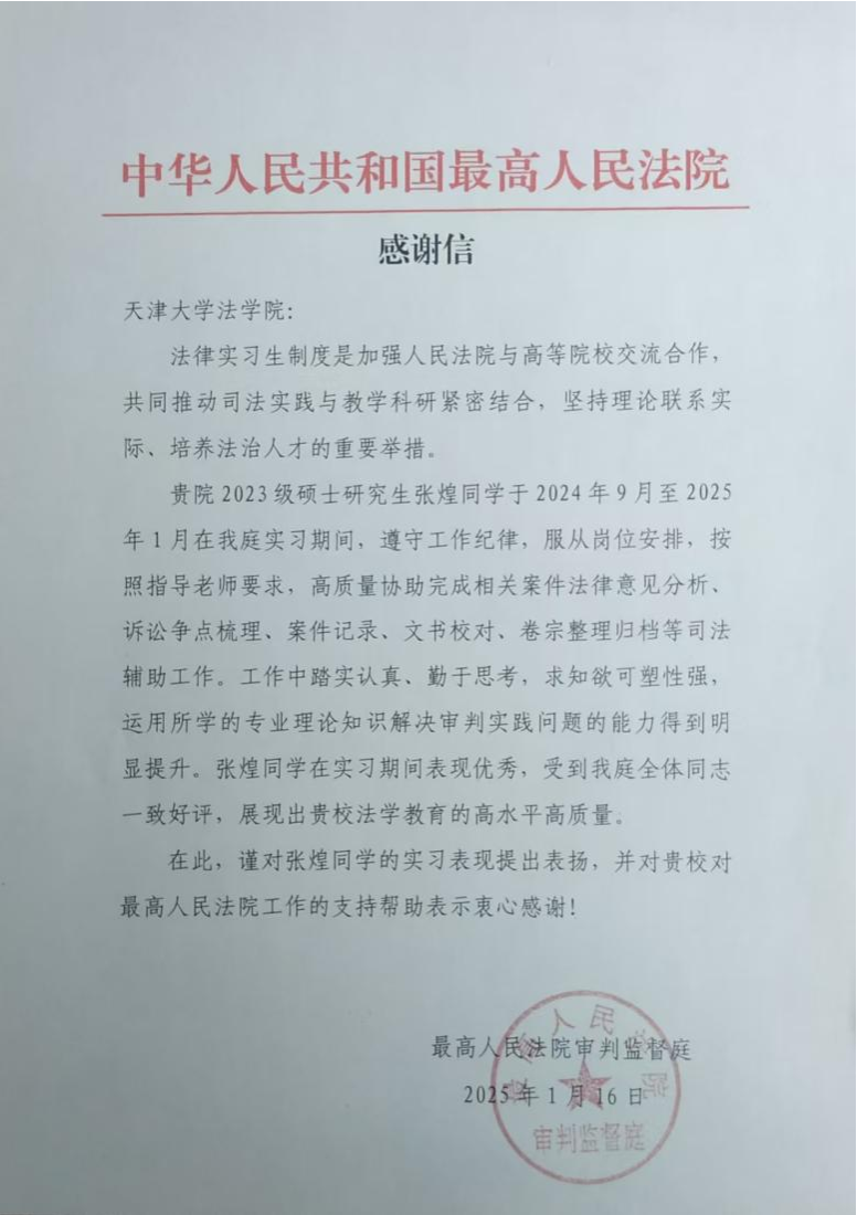 本站讯(法学院供稿)在培养德法兼修的高素质法治人才的时代号召下,2024年最高人民法院面向全国法学院校启动了第十五批法律实习生招募选拔工作。天津大学法学院积极响应最高人民法院法律实习生制度精神,高度重视实习生选拔培育工作,经过严格选拔与推荐,天大法学院知识产权法学2023级博士研究生谢艺婕(导师管荣齐教授)、民事诉讼法学2023级硕士研究生张煌(导师郭小冬教授)凭借扎实的专业知识、出色的综合素质和对司法实践的热忱,成功入选最高人民法院第十五批法律实习生项目,开启了在最高人民法院为期四个月的全职实习之旅。其中,张煌同学在实习期间表现突出,荣获最高人民法院“优秀法律实习生”荣誉称号。