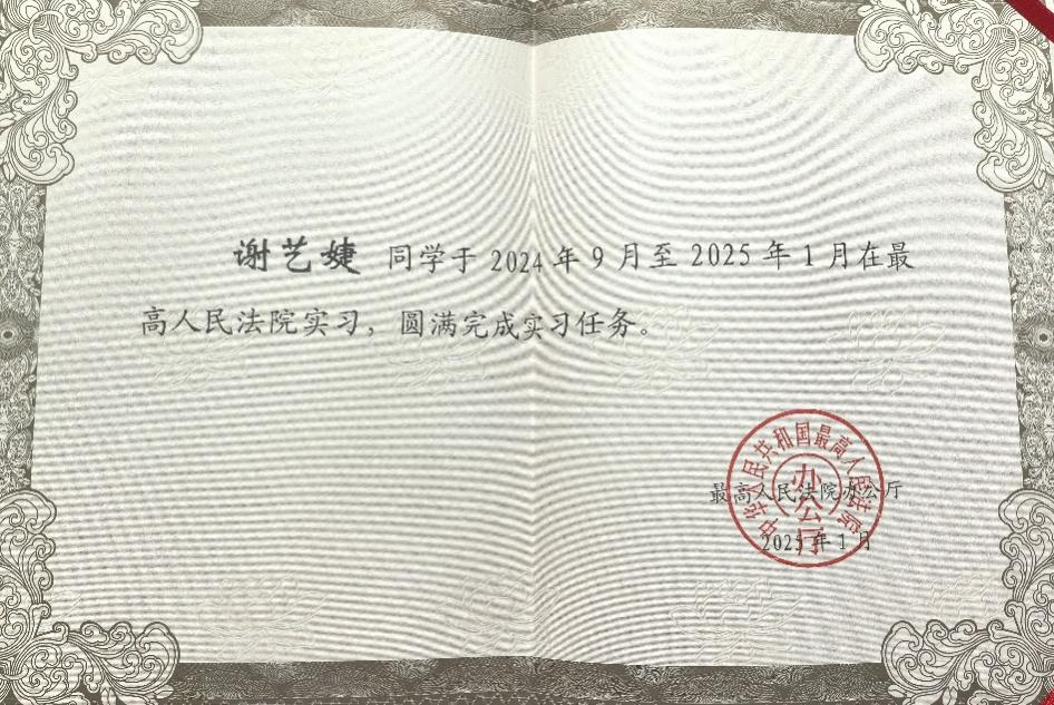 在实习期间,谢艺婕和张煌同学严格遵守最高法的各项工作要求,以高度的责任感和使命感全身心投入到各项工作中。他们积极参与审判辅助工作,协助法官进行案件审理、证据整理、文书起草等,在实践中加深对法律条文的理解和运用;深度参与实务调研,针对司法实践中的热点难点问题展开深入研究,为司法决策提供有价值的参考;同时,他们还积极投身综合行政工作,在司法行政相关事务中锻炼组织协调能力和团队合作精神。