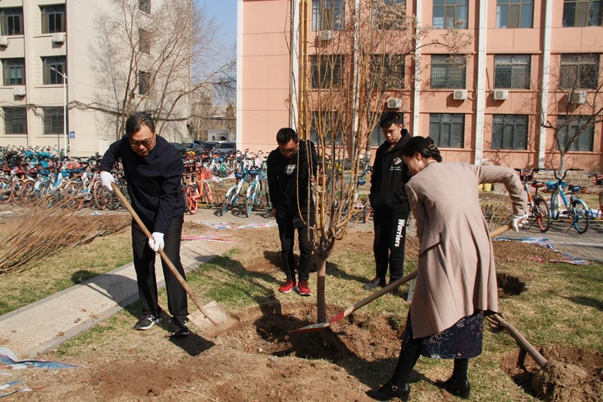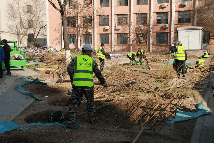 为确保活动的顺利开展,学校后勤保障部校园环境管理科积极做好各项前期准备工作,组织技术人员多次对植树地点进行踏勘并组织施工。捐植活动结束后,校园环境管理科随即组织专业人员对校友们种完的海棠树做入坑后的绑定支撑和修剪,以保障海棠树苗的茁壮成长。