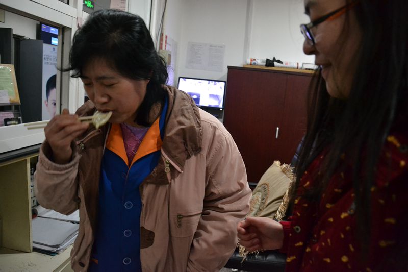 “宿管妈妈,你们辛苦啦,感谢你们的辛勤付出和细心照顾,我们几个来拜个早年。”慰问团学生代表一进值班室,就拉着宿管阿姨的手说道。说话间,学生们早已将一个个饱含“家”味道的饺子送进了宿管员的嘴里。而值班员们对学生的到来感到十分惊喜,宿管员阿姨激动地说:“今天除夕了,大家都在家过年,我们都觉得自己像是被遗忘的人,没想到孩子们会来送饺子,真是太感动了。”