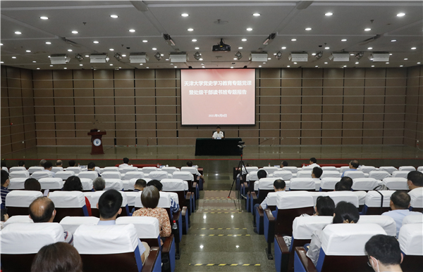 本站讯(组织部供稿 摄影唐蒙)6月8日下午,天津大学党史学习教育专题党课暨处级领导干部读书培训班专题报告在卫津路校区天南楼C4报告厅举行,在北洋园校区郑东图书馆设立视频分会场。校党委副书记、校长金东寒主讲了题为“传承红色基因 汲取奋斗力量”的专题党课。报告会由校党委副书记赵美蓉主持。校领导、校党史学习教育巡回指导组成员、全体中层干部、教工党支部书记、专职组织员及党务秘书等400余人现场参加学习。