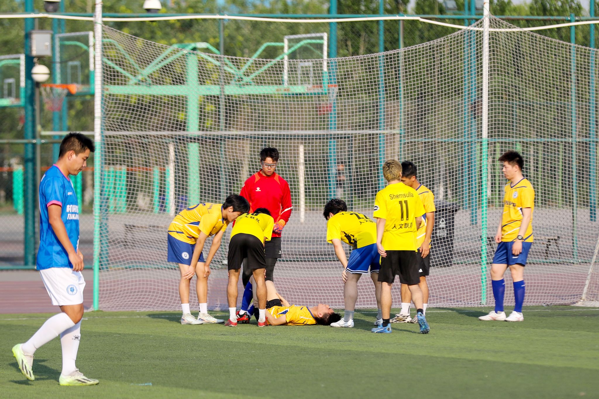 队友查看比赛受伤球员