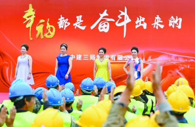 中建三局农民工时装表演队登上T台,为工友们表演。新华社记者 申宏