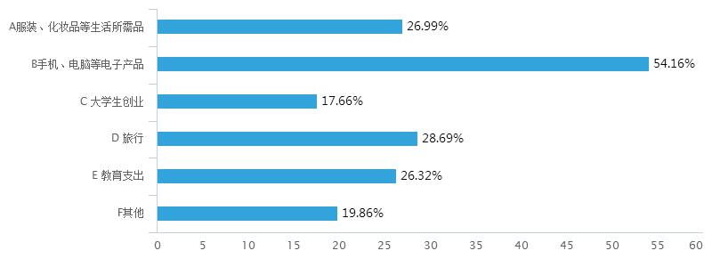 在被问及信贷的主要用途时,选择购买手机和电脑这一项的人超过了半数,是最主要的消费方向。此外,购买化妆品、服装的比例也达到26.99%。考虑性别因素,对数据进行交叉分析后显示,大学女生是购买化妆品和服装的消费主力。