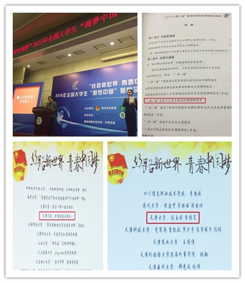 本站讯(通讯员 刘梦茹)11月30日,“丝路新世界•青春中国梦”2015年全国大学生“圆梦中国”暑期社会实践专项行动总结发布会在对外经济贸易大学举行,团中央书记处书记傅振邦和来自全国100多所高校师生代表参加了会议。我校“一带一路”和“丝路创客”两支实践队受到团中央表彰,获得“丝路新世界•青春中国梦”全国大学生暑期实践优秀实践团队、优秀实践调研报告、社区宣讲优秀团队、图片拍摄优秀团队、优秀实践纪录片、优秀首席专家、优秀实践个人等十几项荣誉。