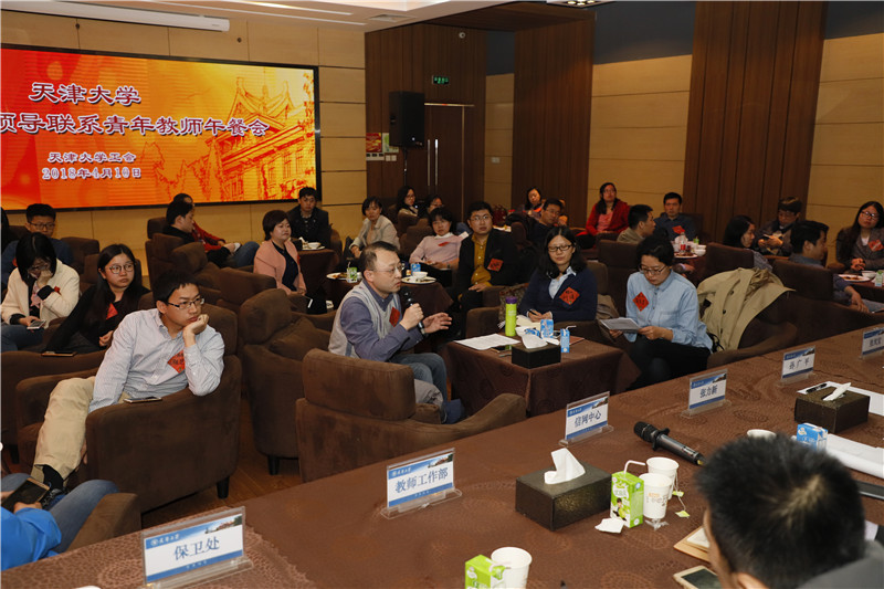 张凤宝首先向参加午餐会的青年教师表示欢迎,充分肯定了青年教师在人才培养、科学研究、社会服务、文化传承与创新等工作中发挥的重要作用。随后张凤宝就所分管的工作和部门,向青年教师们阐述了“大后勤”的概念及其对天津大学“双一流”建设的重要意义,并介绍了学校在后勤保障方面的工作及预期目标。他说,众多后勤保障部门的工作涉及老师们衣食住行的各个方面,而各部门工作的最大宗旨就是尽可能保证每位教师都能够把主要的精力用在教学科研上,能够专心地把自身潜力发挥到极致。随后他向青年教师们介绍了与会的各部门负责人,并就老校区的修缮、两个校区同步的信息化建设、校园安全提升等今年学校后勤方面的主要工作做了简要的说明。他表示非常感谢校工会组织了这样的能够听到一线教师的意见和建议的交流活动,希望大家畅所欲言,各部门立行立改,持续改进整体的后勤保障机制。