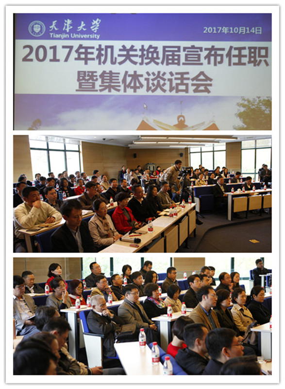 本站讯 10月14日上午,天津大学2017年机关换届宣布任职暨集体谈话会在卫津路校区会议楼第七会议室召开。校党委书记李家俊,校长钟登华,校党委常务副书记舒歌群,校党委副书记、副校长刘东志,校党委副书记、纪委书记孙广平出席会议。李家俊、钟登华、孙广平分别围绕从严干部管理和提升干部能力素质、学校发展新形势下领导干部面临的新任务新要求以及干部队伍党风廉政建设等方面内容对与会全体干部进行了集体谈话。舒歌群主持会议,并代表学校党委对本次换届工作进行总结,同时宣布了对本次机关换届处级干部的任命决定。学校机关全体现岗处级领导干部及机关换届产生的全体处级领导岗位拟任职人员100余人参加了会议。