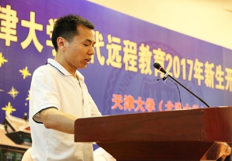 新生代表、富士康科技集团维修工程师金强发言,他感谢天津大学和企业的支持,感谢领导和老师们的帮助,使他的大学梦想得以实现,迈向人生新历程。他表示天津大学网络教育这个平台不仅有同学们渴求的书林翰海、学界鸿儒,更有开拓进取、勇于创新之精神,是同学们学习提升的理想园地。他珍视这次难得的学习机会,将秉承天津大学实事求是的校训,传承天津大学的家国情怀,做天大人、办天大事,拼搏向上,完成学业,取得更大成绩,为学校争光,为企业和国家发展作出自己的贡献。