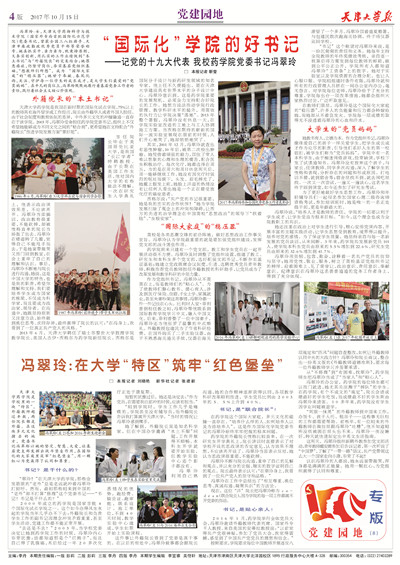 冯翠玲:女,天津大学药物科学与技术学院(国家外专局首批国际化示范学院)党委书记,曾获全国三八红旗手、天津市廉政勤政优秀党员干部等荣誉称号。她真抓实干、亲力亲为,既秉持原则,又务实创新,用扎实的工作业绩做到“本土书记”与“外籍院长”的完美结合;她罹患癌症,仍坚守岗位,夯实基层党组织基础,“想教师们所想”,成为 “国际大家庭”的“稳压器”;她甘于奉献、春风化雨,关注、守护每一位学生的成长成才,是大学生们最爱的“党员妈妈”。在平凡的岗位上,冯翠玲默默地履行着基层党务工作者的责任,践行着社会主义核心价值观。本报本期特推出“党建园地”专版,以飨读者。
