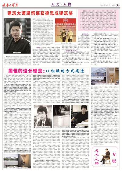 2016年,周恺又摘下了中国建筑界的最高大奖——梁思成建筑奖,这项殊荣实至名归。在2017年梁思成建筑奖的颁奖仪式上,周恺接受了建筑界权威杂志《建筑学报》的采访,回顾并表达了多年来从事建筑设计的历程和感受。本报特引用该采访的部分内容,将建筑师周恺的心声传递给广大师生。