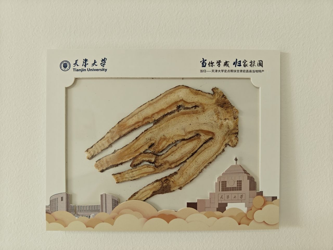 今年天津大学本科生录取通知书以“缘自北洋,梦起海棠”为主题,设计通知书融入以“新”迎新,梦想相承,薪火再燃的思想,结合学生在校获奖作品,彰显天大学子的才华。通知书采用折叠式设计,如同翻开一本历史长卷,一面是百卅天大的历史荣光,一面是天大双校区的风采长卷。通知书融入卫津路92号、雅观路135号、求是亭、北洋纪念亭、绚烂芬芳的海棠花等天大元素,烫银字样的“欢迎你天大人”和手绘线条勾勒海棠倩影与天大建筑交相辉映。随通知书一起寄出的,还有天大品格书签、校园景观书签、“当归”相框、校园文化地图以及每年随通知书寄发的新生银行卡、征兵手册等。其中“当归”相框来自天大定点帮扶的甘肃宕昌县。当归,味甘性温,寄语天大新生在求学路上终有回甘。“当”你学成,“归”家报国,以当归为契,愿未来每一个学子,学有所成,立志报国。