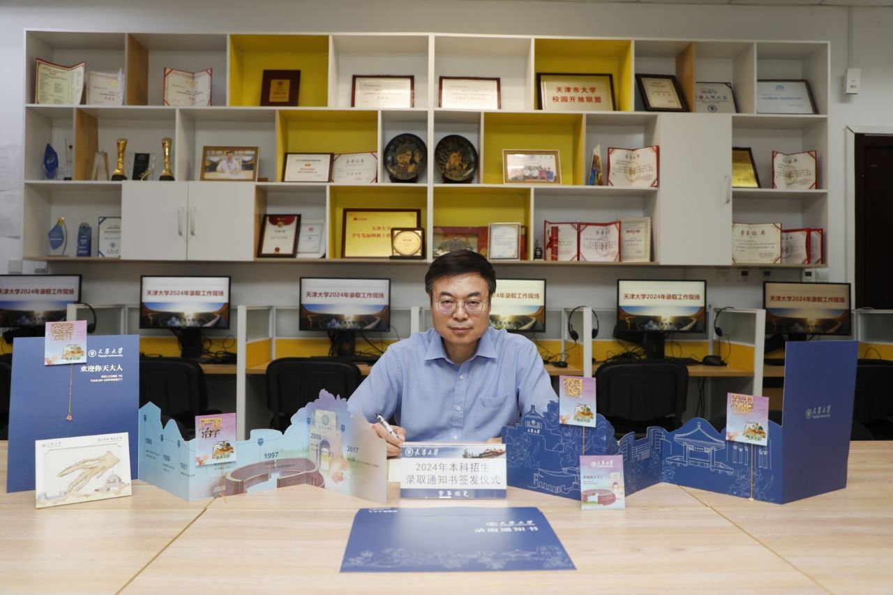 7月12日,天津大学校长金东寒在编号为“0001”号的本科生录取通知书上签下自己的名字,这封录取通知书的“主人”是毕业于浙江省宁波市镇海中学的周紫檀同学,她通过“强基计划”被天津大学数学与应用数学专业录取。随着“0001”号录取通知书的签发,2024年首批本科生录取通知书也将满载着祝福和期冀,陆续寄往全国各地的新天大人手中。