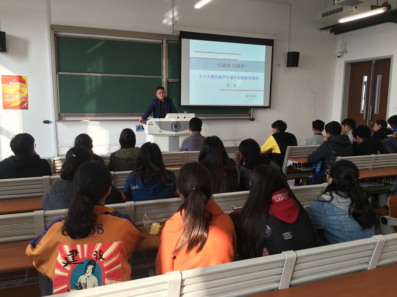 10月28日,天津大学“民族情·中国梦”少数民族学生课外实践教育课程如期开课。新疆教育厅少数民族学生高校内派服务管理教师王帆为天大新疆籍少数民族学生进行新疆历史和民族宗教政策理论讲座,并针对2017级新生遇到的实际困难和问题进行了生动的入学教育,引导学生认识到毕业倒计时从现在开始。天津大学公共管理学博士、西藏大学教师嘎玛达娃为西藏籍少数民族学生进行题为“目标·追求·责任”的讲座,结合个人成长发展经历指导学生应该如何尽快适应内地生活、适应大学生活,把握宝贵的学习机会,努力成为合格人才。