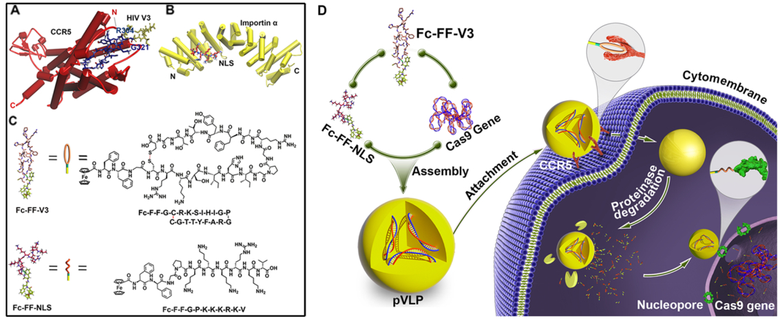 近日,天津大学化工学院齐崴教授团队根据艾滋病(HIV)病毒囊膜蛋白gp120上的V3多肽与猿猴空泡(SV40)病毒大T抗原蛋白的核定位序列(PKKKRKV, NLS),通过分子与纳米仿生,设计了两种具有跨细胞膜与核膜的功能多肽,并调控其组装形成仿病毒纳米颗粒。该颗粒可作为“特洛伊木马”,携带核酸类基因药物,以类似病毒的跨膜方式将药物靶向运送至具有CD4/CCR5趋化因子受体的免疫细胞内(图1),相关研究可为病毒性疾病的靶向基因治疗提供有益参考。工作发表在《Angewandte Chemie-International Edition》,并被遴选为Inside Cover(图2)。论文标题为Rationally designed peptidyl virus-like particles enable targeted delivery of genetic cargo,出版网址为https://onlinelibrary.wiley.com/doi/abs/10.1002/anie.201805868。论文第一作者是天津大学化工学院酶工程与技术课题组博士研究生孔佳,该实验室青年教师王跃飞和齐崴教授为论文的共同通讯作者。