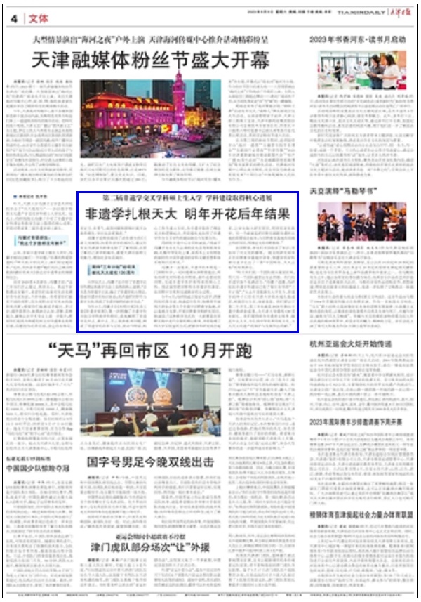 “昨天我们的一个团队刚从瑞安回来,明天另一个团队就要出发去西塘。我们的非遗学如今充满活力。”冯骥才透露,冯研院的非遗学科建设已有了翔实有序的“三年计划”,“从去年首批新生入学至今,非遗学的种子已经在天津大学的土地扎根成活,树苗茁壮生长,绿意盈盈。我们要让它第二年开花,第三年也就是2025年捧出非遗学教研的成果,为天津大学建校130周年献礼。我们要持续为非遗事业培养、输送专业人才,为弘扬中华优秀传统文化、为人类文化遗产的保护与发展作出贡献。”