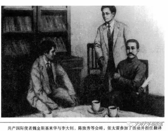 ▲张太雷陪同维经斯基会见李大钊、陈独秀