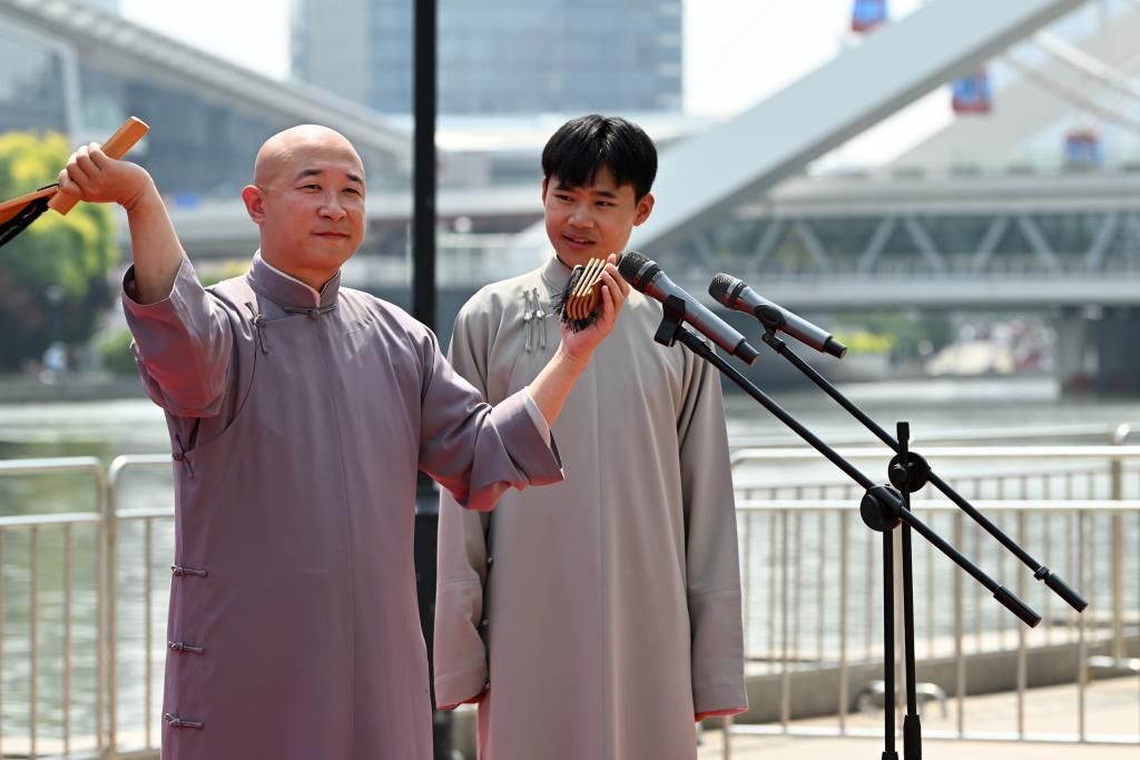 相声演员在天津市红桥区的三岔河口亲水平台表演节目。新华社记者 李然 摄