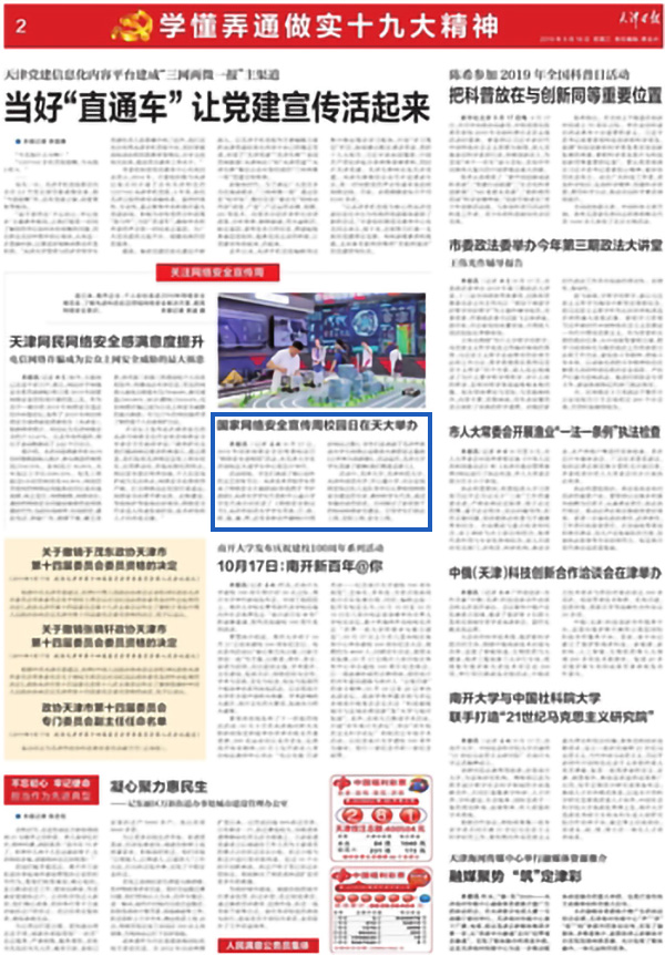 本报讯(记者 姜凝)9月17日,2019年国家网络安全宣传周校园日“网络安全进校园”活动,在天津大学北洋园校区大通学生中心报告厅举行。