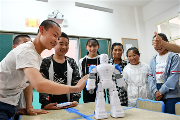 宕昌县的梦想教室里,孩子们第一次见到智能机器人跳舞。天津大学支教队供图