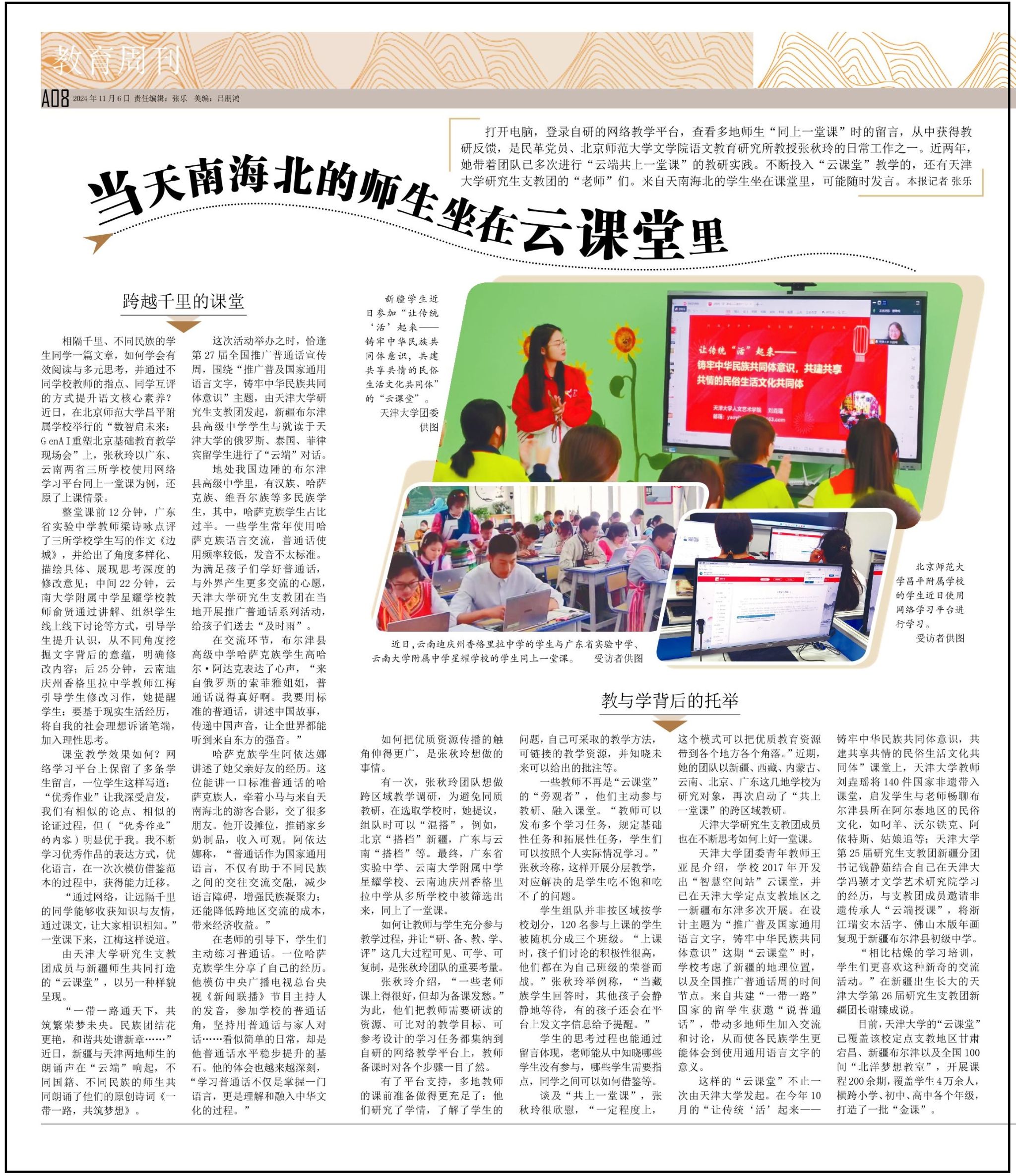 天津大学团委青年教师王亚昆介绍,学校2017年开发出“智慧空间站”云课堂,并已在天津大学定点支教地区之一新疆布尔津多次开展。在设计主题为“推广普及国家通用语言文字,铸牢中华民族共同体意识”这期“云课堂”时,学校考虑了新疆的地理位置,以及全国推广普通话周的时间节点。来自共建“一带一路”国家的留学生获邀“说普通话”,带动多地师生加入交流和讨论,从而使各民族学生更能体会到使用通用语言文字的意义。
