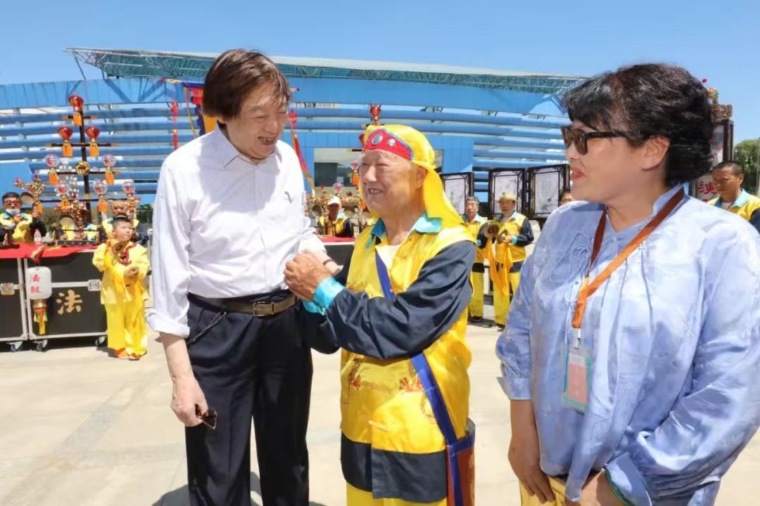 2023年6月,在天津大学冯研院非遗学“田野教学基地”成立仪式上,冯骥才与“天津皇会”非遗传承人交流。(资料照片 天津大学冯研院提供)