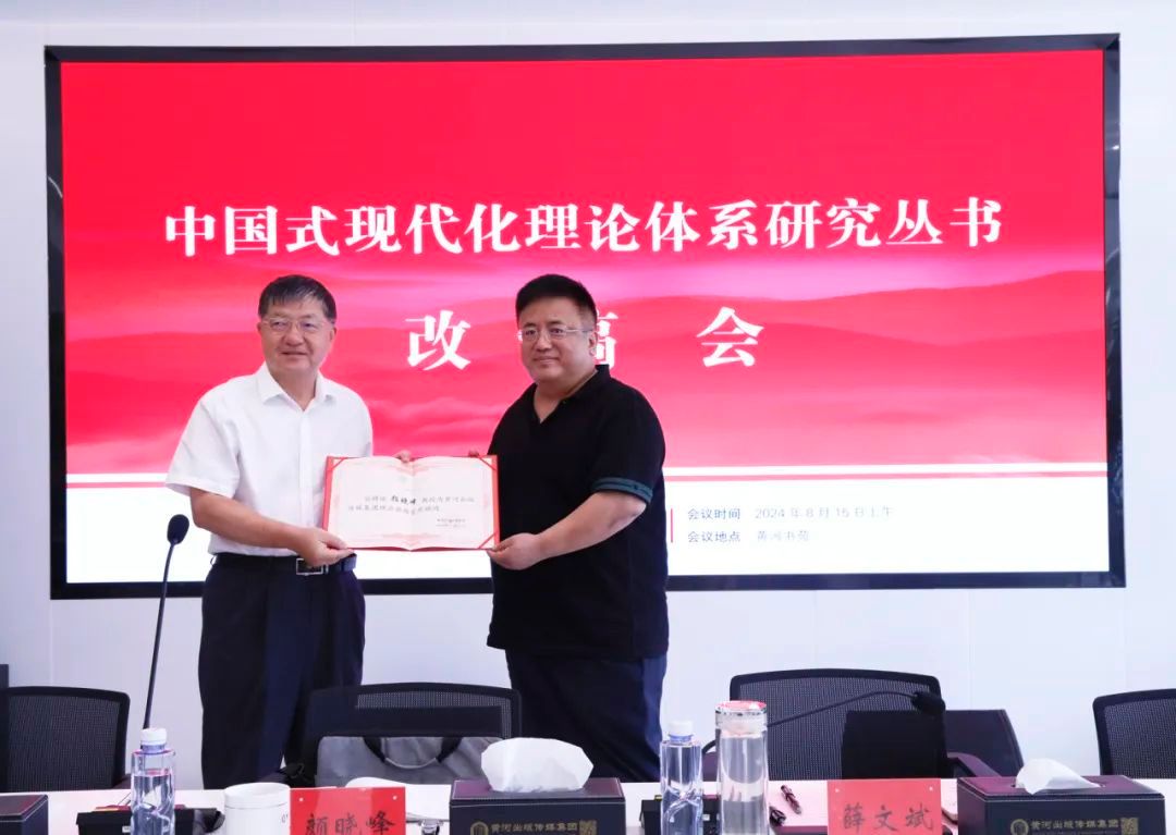本站讯 8月15日上午,由黄河出版传媒集团、天津大学马克思主义学院主办,宁夏人民出版的社承办“中国式现代化理论体系研究丛书”改稿会在银川黄河书苑举行。天津大学马克思主义学院书记孙鹤,天津大学马克思主义学院院长颜晓峰,天津大学马克思主义学院专家学者组成的“中国式现代化理论体系研究丛书”创作团队,以及黄河出版传媒集团党委书记、总经理、总编辑薛文斌,黄河出版传媒集团副总经理杨立国,宁夏人民出版社编辑团队出席改稿会。改稿会上,薛文斌向颜晓峰院长颁发了黄河出版传媒集团理论出版首席顾问证书。