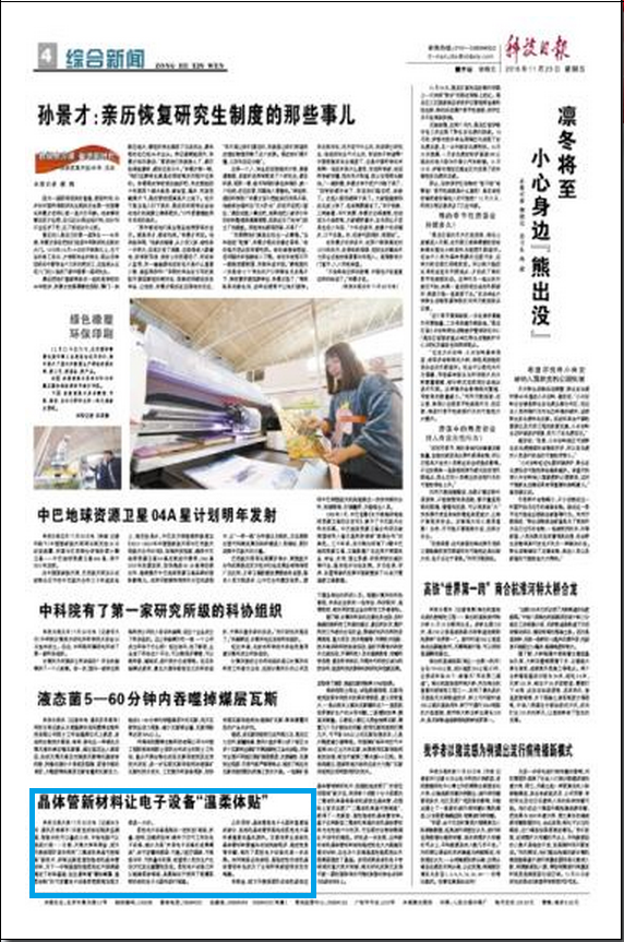 本站讯(记者 孙玉松 通讯员 焦德芳)手套变成体征随身监测器,智能手机可以叠成小块、平板电脑可以卷进口袋……日前,天津大学李荣金、胡文平教授团队首次利用“二维有机单晶可控制备”新技术,研制出新型高性能有机晶体管材料,为下一步制造高性能柔性红外探测器奠定了材料基础,也这意味着“薄如蝉翼、温柔体贴”的可穿戴电子设备梦想距离实现又前进一大步。