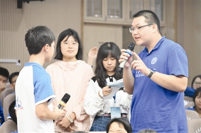 图为湖南省株洲市茶陵县茶陵二中同学与天津大学“芯梦创响”宣讲团同学交流。