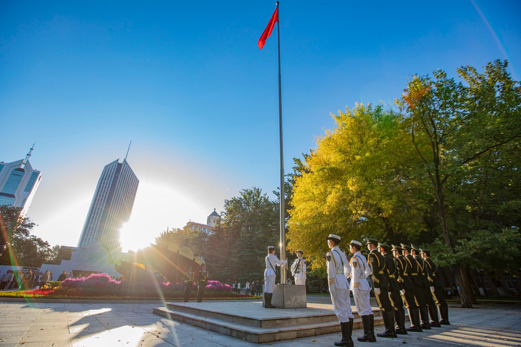 10月1日清晨,天津大学在双校区举行国庆升旗仪式,上千名师生共同见证这一伟大而庄严的时刻。伴随着响亮的口令,校国旗护卫队队员身姿挺拔,迈着整齐划一、铿锵有力的步伐,护送国旗至升旗台前。雄壮的《义勇军进行曲》响起,在同学们庄严齐唱中,鲜艳的五星红旗冉冉升起,迎风飘扬。参加升旗活动的学生代表杨博和范芯羽表示,天大学子新时代新征程更应牢记“兴学强国”使命,为实现中华民族伟大复兴贡献强大力量。