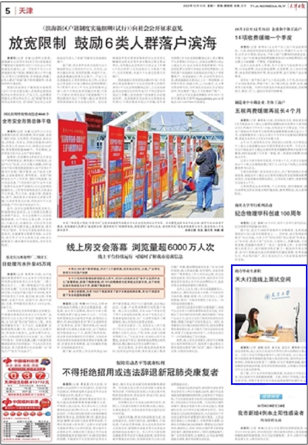 据了解,天大各学院积极挖掘资源,改造部分学院会议室、办公室给学生求职提供保障。目前,学校已开放线上面试空间27间,并将于本月中旬开放在线场地预约申请平台,以满足学生个性化求职需求。