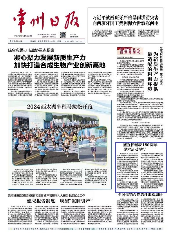 本站讯 11月2日,盛宣怀诞辰180周年学术活动在我市举行。来自全国高等院校、社科研究机构、学术团体的专家学者,盛氏后裔以及盛宣怀当年创业奠基的相关单位领导和代表参加活动。天津大学党委书记杨贤金、常州大学党委书记徐守坤,市领导杨芬、蒋鹏举、祝正庆、完利梅出席活动。本次活动由常州大学、常州海外联谊会、常州市盛宣怀研究会、常州市红十字会、晋陵文旅集团,会同天津大学联合举办,共同纪念盛宣怀,弘扬长三角工商文化,赋能推进强国复兴。当天举办了丰富的学术活动,包括“盛宣怀近代自强探索与强国复兴伟业学术座谈会”和“兴学强国与发展新质生产力研讨会”,与会专家学者围绕“兴学强国与盛宣怀研究”“盛宣怀创新之路与发展新质生产力研究”两个主题进行分组讨论。活动现场还举行了《中国近代化进程中的盛宣怀》新书首发仪式。该书由常州市盛宣怀研究会策划编撰出版,分为上、中、下三册共180个故事,图文并茂地讲述了盛宣怀在工商实业、教育事业和社会事业的精彩事迹。邮册《盛世宣古怀真》正式发行,并同步发行了《盛宣怀诞辰180周年纪念》定制邮票。其中,邮册内容分为工商实业篇、高等教育篇、社会事业篇、未来展望篇,配有《甲辰年》龙票和《招商局》《国脉所系 传邮万里》《天津大学建校120周年》《交通大学建校120周年》等珍贵邮票20套。当天,常州大学宣怀产业创新学院揭牌成立。微电影《盛宣怀自强打拼启示》和舞台剧《盛宣怀》精彩上演。