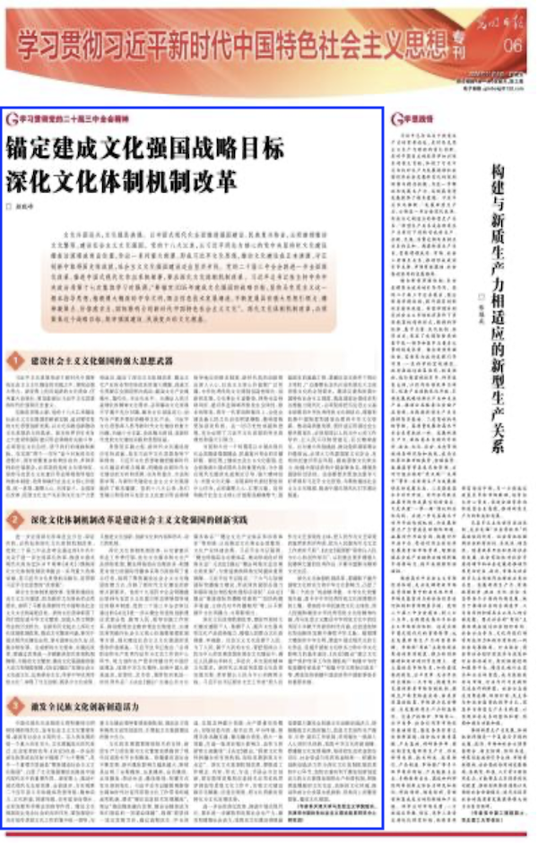 中国式现代化是物质文明和精神文明相协调的现代化,没有社会主义文化繁荣发展,就没有社会主义现代化。在人类发展的每一个重大历史关头,文化都能成为时代变迁、社会变革的先导。《决定》在进一步全面深化改革的总目标中强调了“七个聚焦”,其中一个重要方面就是“聚焦建设社会主义文化强国”,凸显了文化强国建设在推进中国式现代化中的重要作用。新征程上,推动中国式现代化全面发展、全面进步,为实现第二个百年奋斗目标提供思想导航、精神动力、文化环境,探索性强、任务复杂而艰巨,必须发挥科学理论的指导作用。建设文化强国是全党全社会的共同任务,要加强党中央对宣传思想文化工作的集中统一领导,完善文化建设领导管理体制机制,调动各方面积极性主动性创造性,汇聚起文化强国建设的强大合力。
