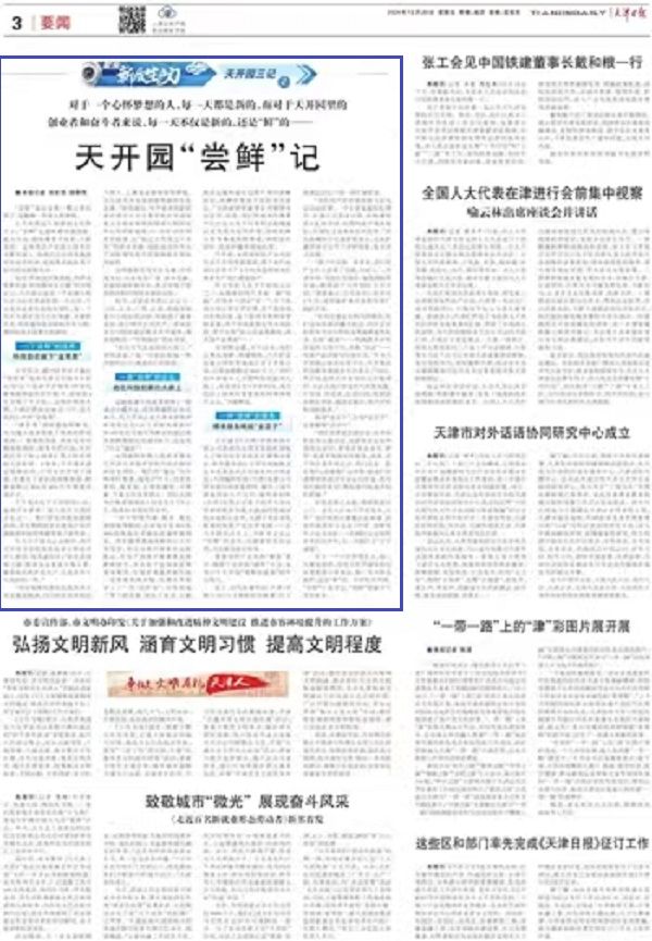 天开燧世(天津)智能科技有限公司获得的全国首张脑机智能人工神经信息系统医疗器械注册证,标志着我国自主研发的脑机交互系统装备正式从临床向市场进发;天润瀚阳科技(天津)有限公司研发成功的镍基焊材,填补了国内镍基焊材生产空白;耀科新材料(天津)有限公司基于南开大学化学学院教授张振杰独创的熔融绿色合成核心技术,突破了共价有机框架材料量产的世界难题……在天开园的沃土上,不断有企业以“尝鲜”的姿态,突破着技术的边界,书写着创新的故事。